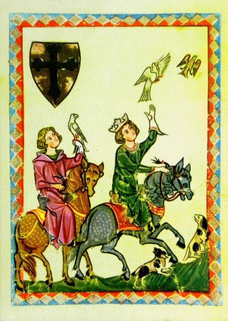 Deze afbeelding is een beroemde miniatuur uit de Codex Manesse (ca. 1300-1340) en één van de belangrijkste verzamelingen van middeleeuwse’, Duitse liederen.