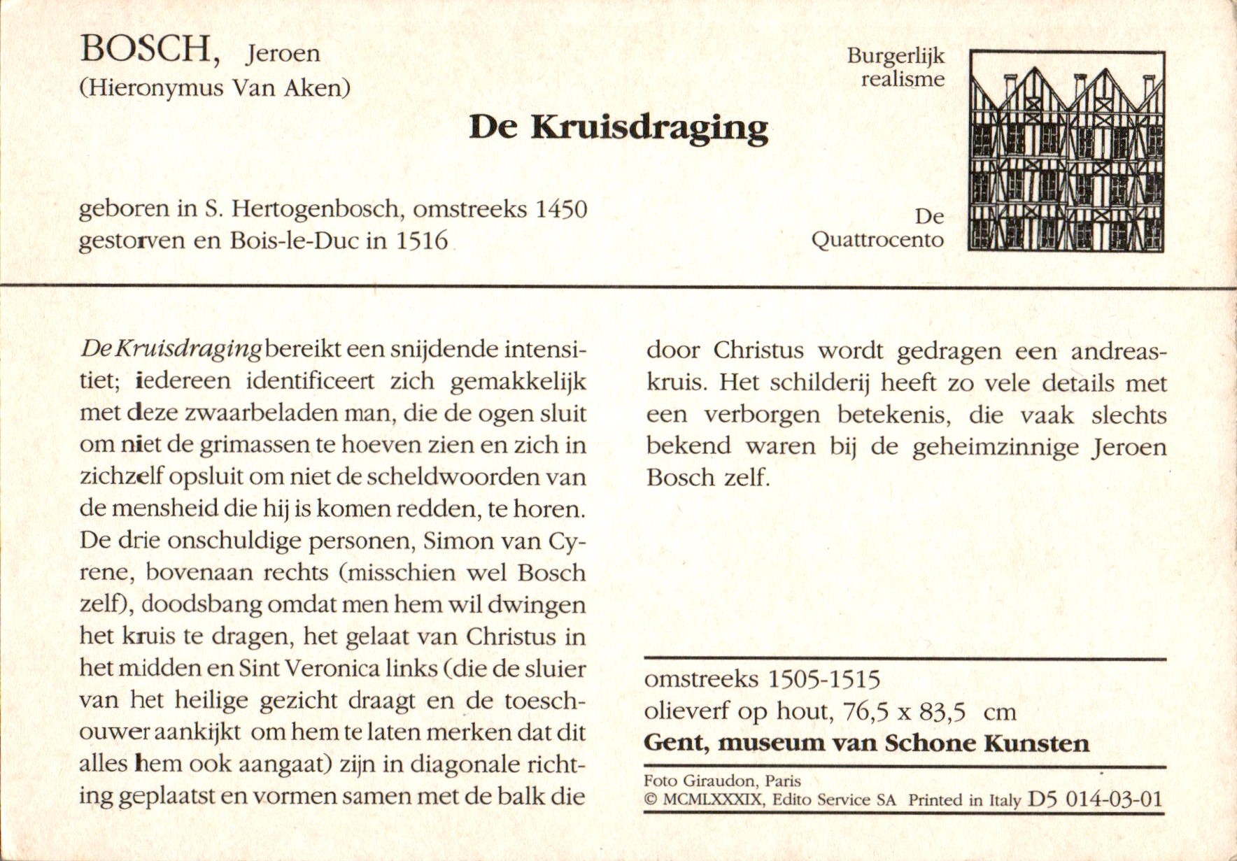 Dit werk ‘De kruisdraging’ is een schilderij, toegeschreven aan de Zuid-Nederlandse schilder Jheronimus Bosch, in het Museum voor Schone Kunsten in Gent.