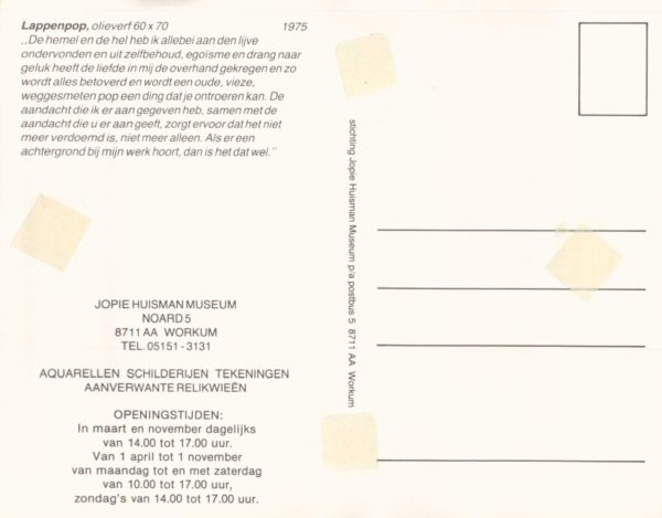 Jopie Huisman werd in Workum op 18 oktober 1922 geboren en overleed in Groningen op 29 september 2000. Huisman was een op-en-top autodidact maar dan wel één van de buitencategorie. Noch geschoold noch begeleid of gecoached door collegae kunstenaars heeft hij desondanks een verbazingwekkend fraai oeuvre weten op te bouwen. Huisman wordt dan ook meer en meer gewaardeerd en kan zeker tot de topkunstenaars uit de twintigste eeuw worden gerekend. Terecht is inmiddels een museum aan hem gewijd, ...