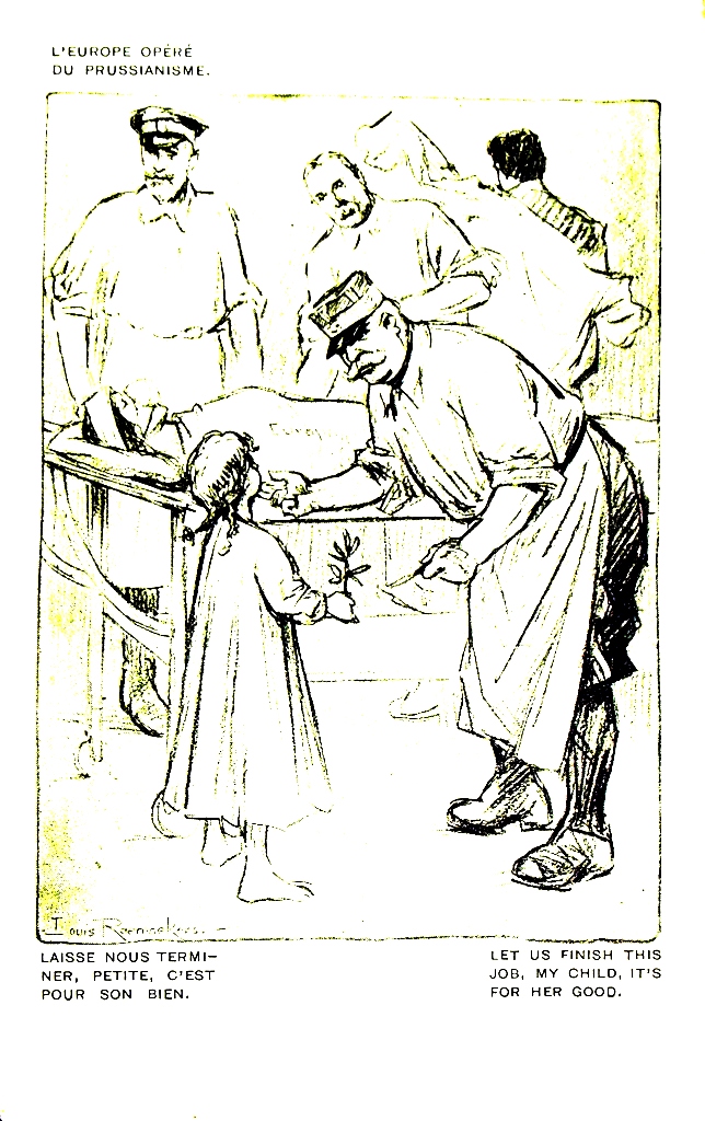 Louis Raemaekers was in Europa één van de allerbekendste Nederlandse cartoonisten / (politieke) tekenaars (naast uiteraard Willy Sluiter) in de eerste helft van de 20ste eeuw. Vooral zijn snijdende spotprenten over de 1ste Wereldoorlog werden massaal (internationaal) gedrukt en verspreid onder zowel vriend als vijand. Maar zijn ‘culturele’ verzet tegen de idiotie van oorlogen (en die van de 1ste Wereldoorlog in het bijzonder) klonk ook na de beëindiging ervan nog jaren na. Om te beginnen werden na de Vrede van Versailles door diverse uitgeverijen – waaronder de Nederlandse ‘De Telegraaf’ uit Amsterdam – uitgaven verzorgd van zijn oudere cartoons en andere producten – vaak in de vorm van ansichtkaarten – met als doel om middelen te genereren voor materiële hulp aan de vele duizenden oorlogsslachtoffers.