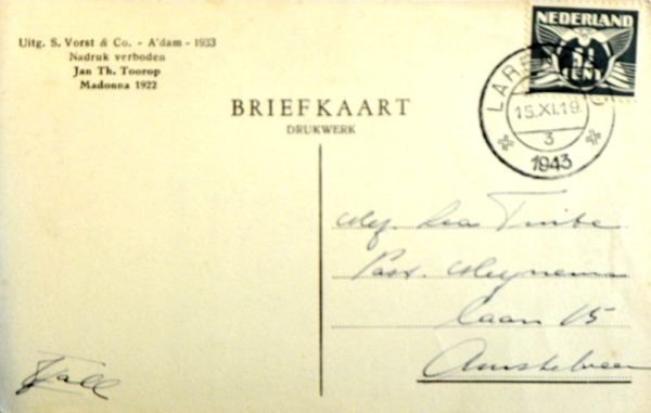 Van meerdere kunstenaars worden ook na hun dood nog kunstwerken verspreid via nadrukken of zoals in dit geval middels ansichtkaarten. En soms worden hun werken achteraf (zelfs seriematig) gedrukt en uitgegeven door meerdere uitgevers. Een terecht initiatief, want het werk van Toorop boeide en boeit nog steeds vele. En of het nu komt door zijn manier van tekenen, lithograferen of etsen dan wel de wijze waarop hij emoties weet toe te voegen aan schijnbaar minimale onderwerpen of personen, eenieder zal dat anders beleven.