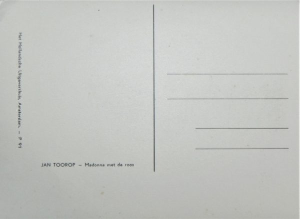 De uitgever S. Vorst & Co., Amsterdam gaf de kaart de titel ‘Madonna 1922’ op de voorzijde terwijl de uitgever Het Hollandsche Uitgevershuis de kaart de titel ‘Madonna met de roos’ meegaf. De (onvolledige) Toorop codificatie kende aan de litho het nummer P 91 toe. En dit laatste nummer hanteren wij ook. De uitgave van Het Hollandsche Uitgevershuis hanteerde een aparte maat (14,9 x 10,9).