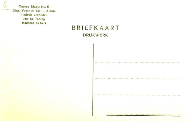 Van meerdere kunstenaars worden ook na hun dood nog kunstwerken verspreid via nadrukken of zoals in dit geval middels ansichtkaarten. En soms worden hun werken achteraf (zelfs seriematig) gedrukt en uitgegeven door meerdere uitgevers. Een terecht initiatief, want het werk van Toorop boeide en boeit nog steeds vele. En of het nu komt door zijn manier van tekenen, lithograferen of etsen dan wel de wijze waarop hij emoties weet toe te voegen aan schijnbaar minimale onderwerpen of personen, eenieder zal dat anders beleven.