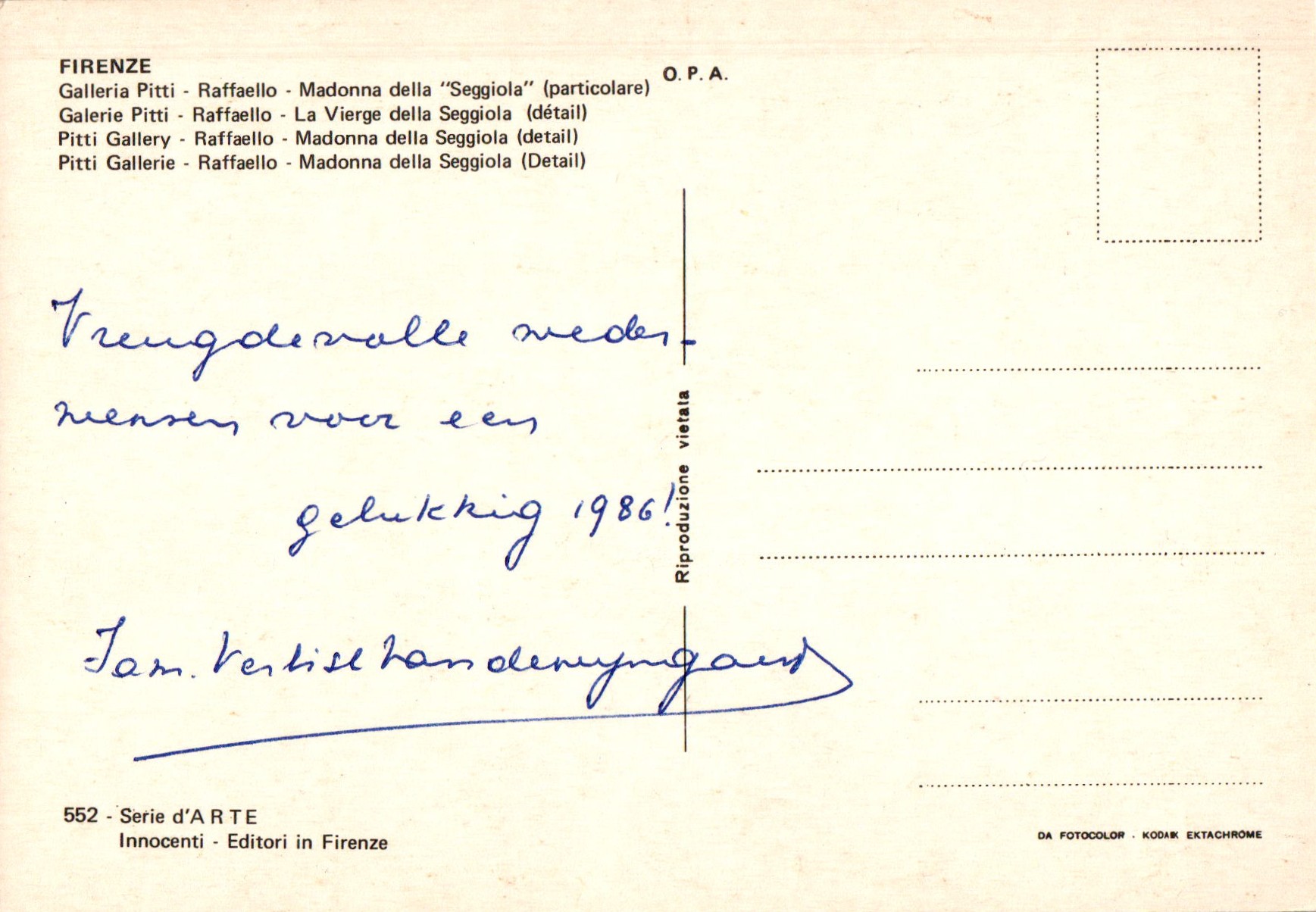 Van vele kunstenaars worden voortdurend – in dit geval van Rafaël – kunstwerken verspreid middels ansichtkaarten. De uitgevers van deze ansichtkaarten zijn onbekend respectievelijk Alterocca, Terni (zie ook de foto). Het origineel bevindt zich in de Galieria Pitti, Florence.