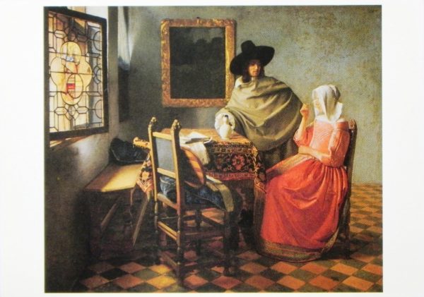 Van meerdere kunstenaars worden voortdurend – in dit geval van Johannes Vermeer maar pas lange tijd na zijn dood – kunstwerken verspreid via nadrukken of zoals in dit geval middels ansichtkaarten. Deze werd uitgegeven door Gemäldegalerie Berlin, het Staatliche Museen Preußischer Kulturbesitz (zie de tweede foto, No. 225). Een terecht initiatief, want deze schildering verrast zelfs als ansichtkaart. Het werk zelf maakt deel uit van de Gemäldegalerie Berlin, het Staatliche Museen Preußischer Kulturbesitz, Berlin.