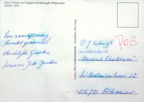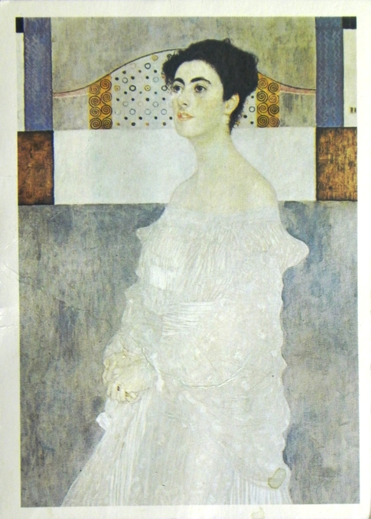 Van meerdere kunstenaars worden voortdurend – in dit geval van Gustav Klimt maar pas na zijn dood – (details van) kunstwerken verspreid via nadrukken of zoals in dit geval middels ansichtkaarten. Deze werd uitgegeven door uitgeverij Eurodition, Den Haag (zie ook de tweede foto). Een terecht initiatief, want het oorspronkelijke schilderij is van grote kwaliteit. Het origineel zich bevindt zich in München in de Neue Pinakothek.