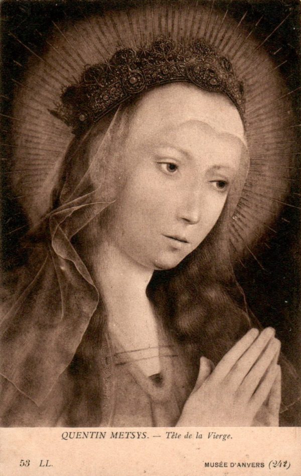 Van dit door Quinten Massijs geschilderd Maria-portret bevat de collectie een gelopen briefkaartversie [COL 1709.014, (14 x 8,8)] en een niet gelopen zw-ansichtkaartversie [COL 1709.014b, (14 x 8,8)].