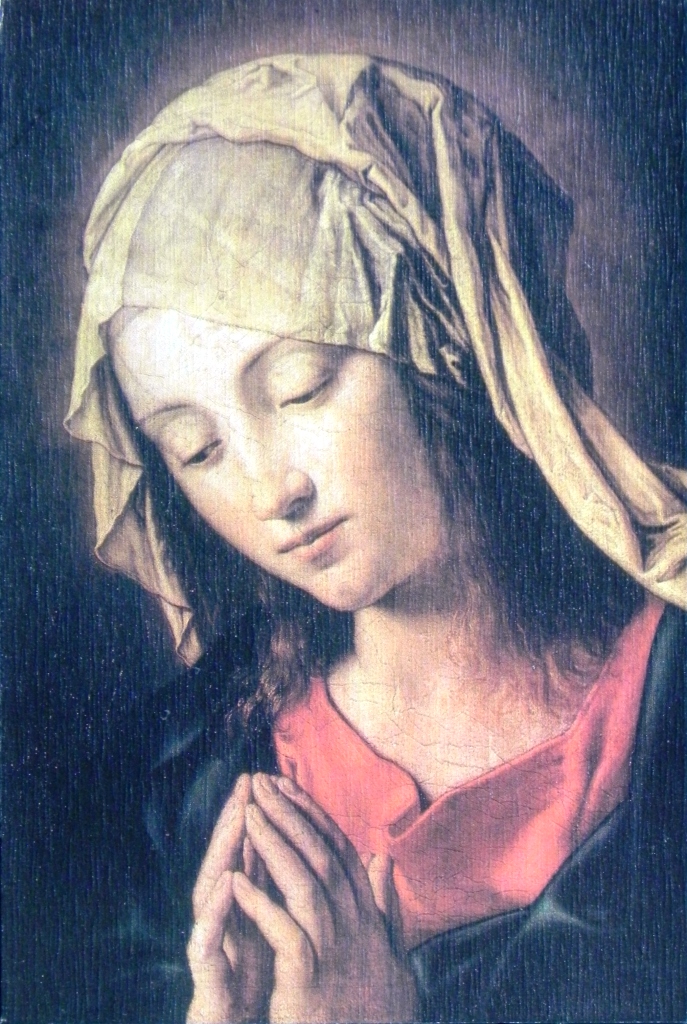 Van meerdere kunstenaars worden voortdurend – in dit geval van Giovanno Battista Salvi da Sassoferrato maar pas lange tijd na zijn dood – kunstwerken verspreid via nadrukken of zoals in dit geval middels ansichtkaarten. Deze werd uitgegeven door de Stichting voor Wereld Welzijn, Vogelenzang (zie ook de tweede foto, nr. K. 4). Een terecht initiatief, want deze schildering verrast zelfs als ansichtkaart. Waar het oorspronkelijke werk zich bevindt is ons niet bekend.