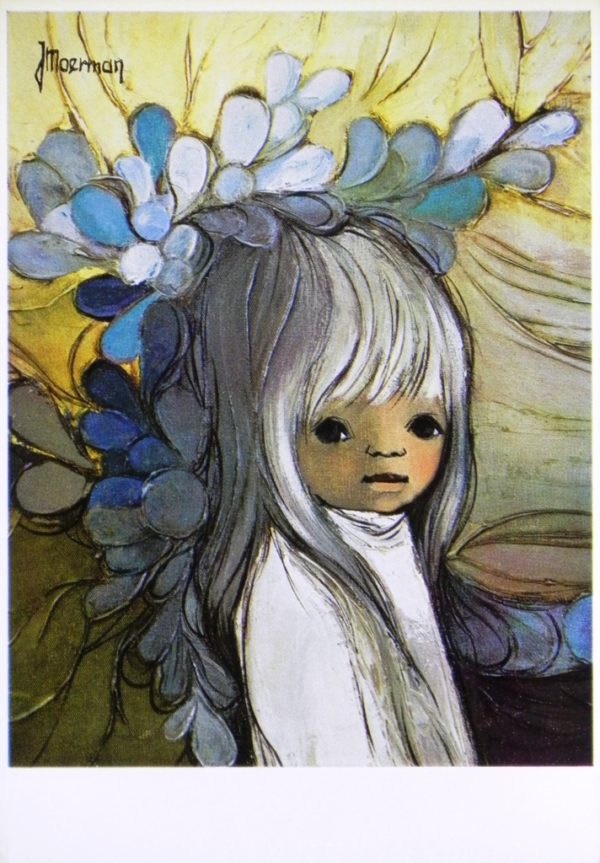Van meerdere kunstenaars worden voortdurend – in dit geval van Jaklien Moerman maar pas na haar dood – kunstwerken verspreid via nadrukken of zoals in dit geval middels ansichtkaarten . Deze werd uitgegeven door Lannoo, Tielt (zie ook de tweede foto, PKS 37). Een terecht initiatief, want dit schilderij is zelfs als ansichtkaart van ontroerende klasse.