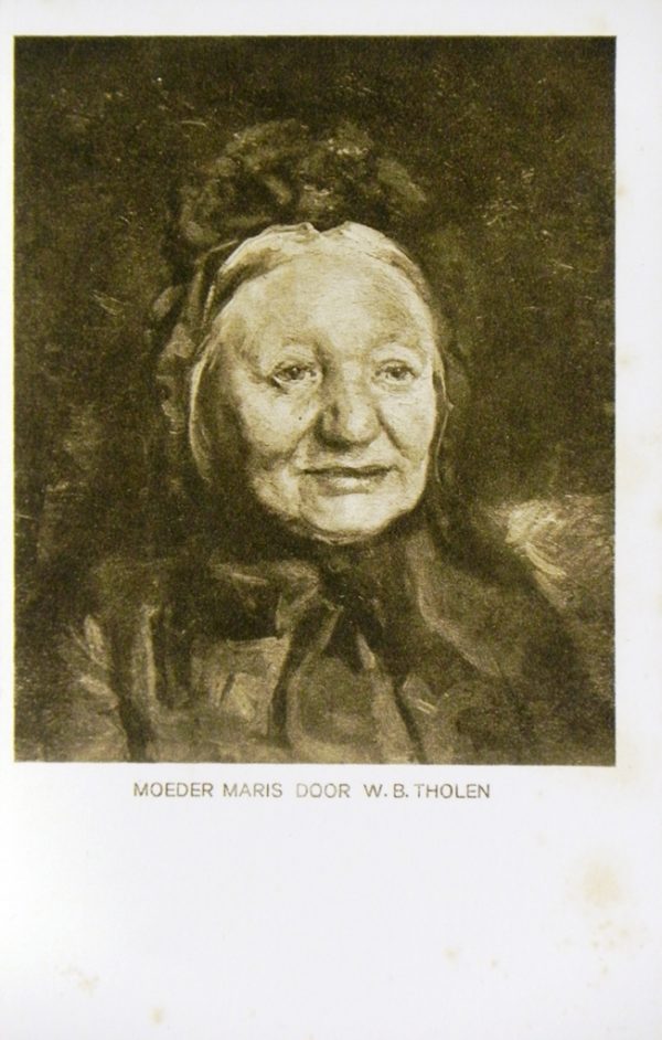 Van meerdere kunstenaars worden ook na hun dood nog kunstwerken verspreid via nadrukken of zoals in dit geval middels ansichtkaarten (zie onder andere ook COL 310.008). Deze werd uitgegeven door het Gemeentemuseum Den Haag (zie de tweede foto, nr 23-5951). Een terecht initiatief, want het werk van Willem Bastiaan Tholen boeide en boeit nog steeds velen. En of het nu komt door zijn manier van tekenen, lithograferen of etsen dan wel de wijze waarop hij emoties weet toe te voegen aan schijnbaar minimale onderwerpen of – in dit geval – een portret van moeder Maris, eenieder zal dat anders beleven.