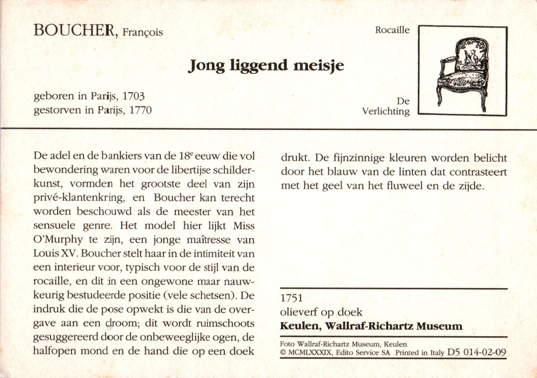 François Boucher werd op 29 september 1703 in Parijs geboren en overleed daar ook op 30 mei 1770. Hij was koud gelieerd aan de schilders Jean-Batiste Deshayes en Pierre-Antoine Baudouin. Boucher volgde een kunstzinnige opleiding aan de Académie Royale de Peinture et de Sculpture in Parijs en was onder andere leerling bij Louis Galloche en Jean-François de Troy. Later werd hij zelf docent en zelfs directeur van de Académie waar hij onder zijn leerlingen onder andere telde Giuseppe Baldrighi...
