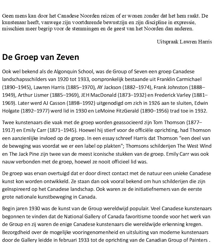 De Groep van Zeven Ook wel bekend als de Algonquin School waren 7 Canadese landschapsschilders [Franklin Carmichael (1890–1945), Lawren Harris (1885–1970), Alexander Young Jackson (1882–1974), Frank Johnston (1888–1949), Arthur Lismer (1885–1969), James Edward Hervey MacDonald (1873–1932) en Frederick Varley (1881–1969) later uitgebreid tot 9 (Alfred Joseph Casson (1898–1992), Edwin Holgate en LeMoine FitzGerald. Ofschoon geen lid worden Tom Thomson en Emily Carroo tot de ...