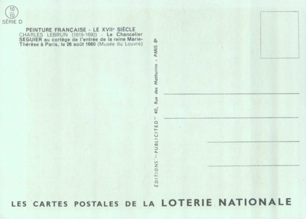 Deze kunstkaart (COL 2551.001) vertoont een deel van het schilderij ‘Kanselier Sequier trekt met koningin Marie-Thérèse Parijs binnen‘. Het volledige doek werd door de Loterie Nationale (COL 2551.001b) als reclamekaart gebruikt voor een nationale loterij.