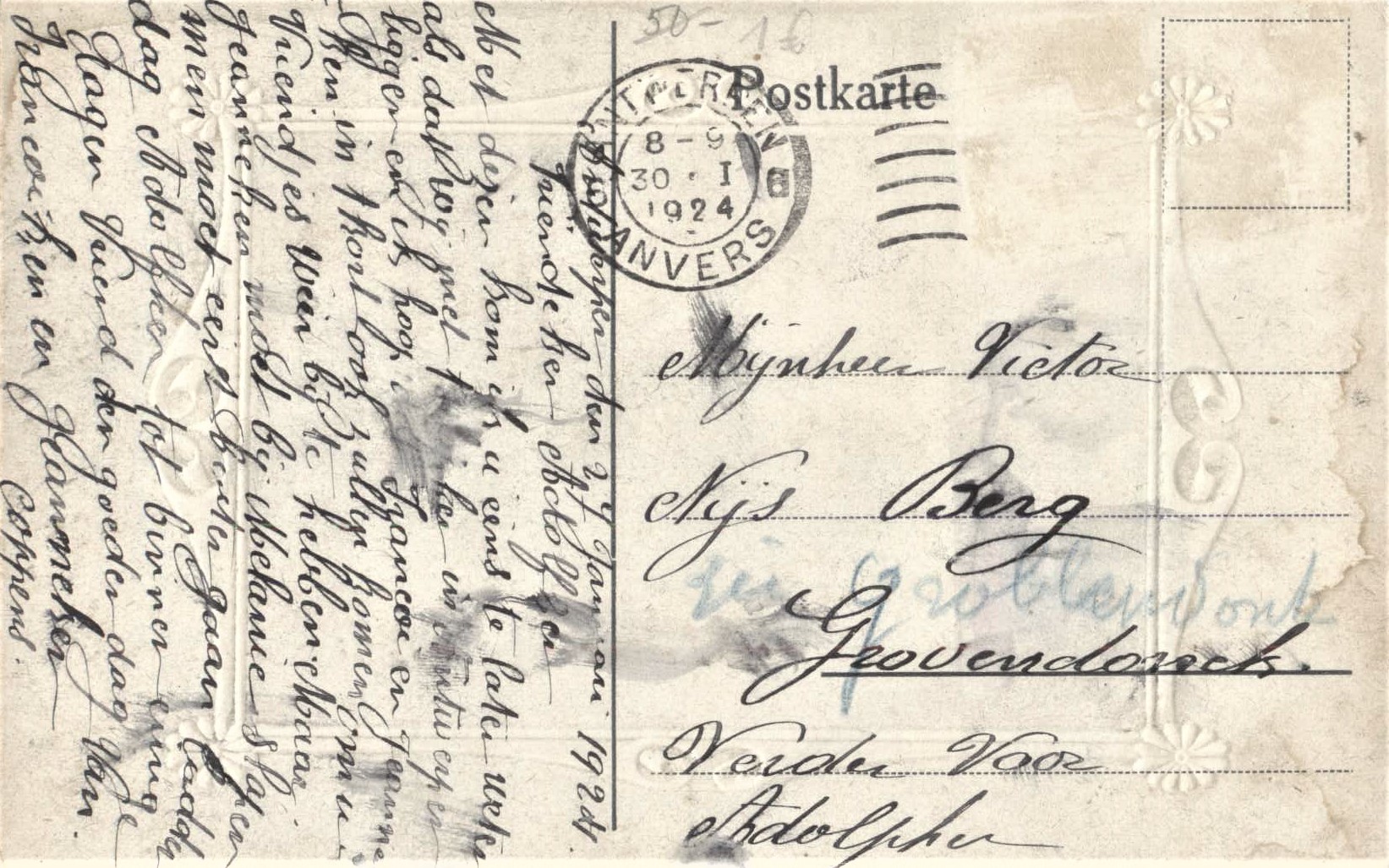 Daarnaast lezen we aan de keerzijde dat hier formeel sprake is van een postkaart terwijl er geen sporen zijn achtergelaten door gom van een (verwijderde?) frankeerzegel en de kaart als zodanig toch is afgestempeld op een postkantoor in Antwerpen. De datum van de poststempel luidt overigens: 30 januari 1924.