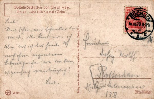 Er zijn nog 12 andere volksliedkaarten van Paul Hey onder de nummers 901 – 912 (deze worden “foto ansichtkaarten” genoemd) en ook nog 20 soldatenliedkaarten van Paul Hey met de nummers 1 – 20 bekend.