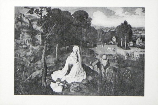 Dit landschap genaamd (rood geaccentueerd) – Rust in Egypte – werd dus geschilderd door Joachim Patinir. Het hoeft weinig betoog dat hij een meer dan begenadig landschapsschilder was. Bijgaande kunstprentkaart onderstreept dit ondubbelzinnig.
