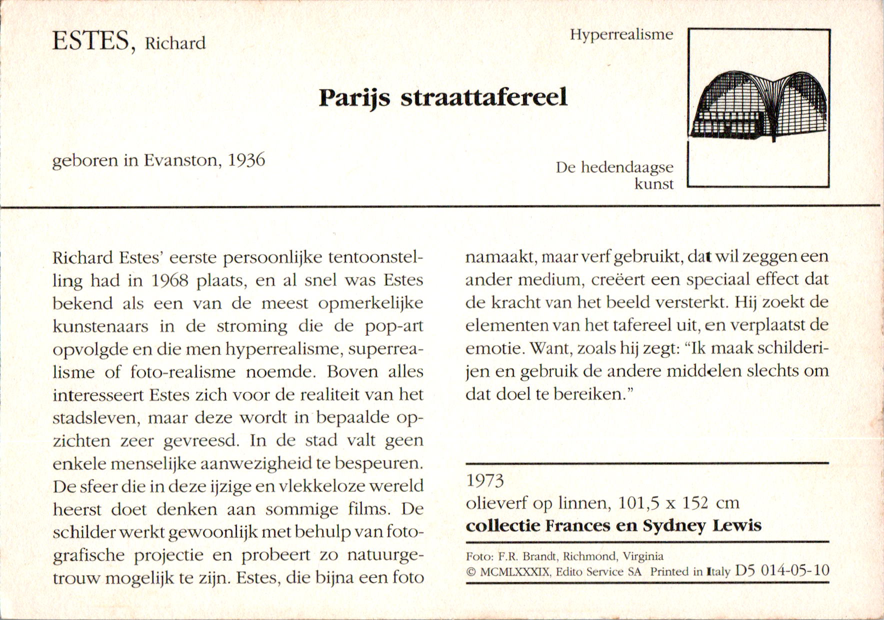 Richard Estes werd op 14 mei 1932 in Kewanee (Illinois) geboren. Hij is een Amerikaans schilder, fotograaf en graficus (zeefdrukken) behorend tot het hyper- of fotorealisme. Richard volgde een kunstzinnige opleiding aan het Art Institute of Chicago (figuurtekenen en traditionele schilderkunst). Hij verhuisde naar New York om zijn brood te verdienen met illustreren en lay-outs ontwerpen. Vanaf 1966 wijdde hij zich geheel aan de schilderkunst en concentreerde zich op het stadsleven ...