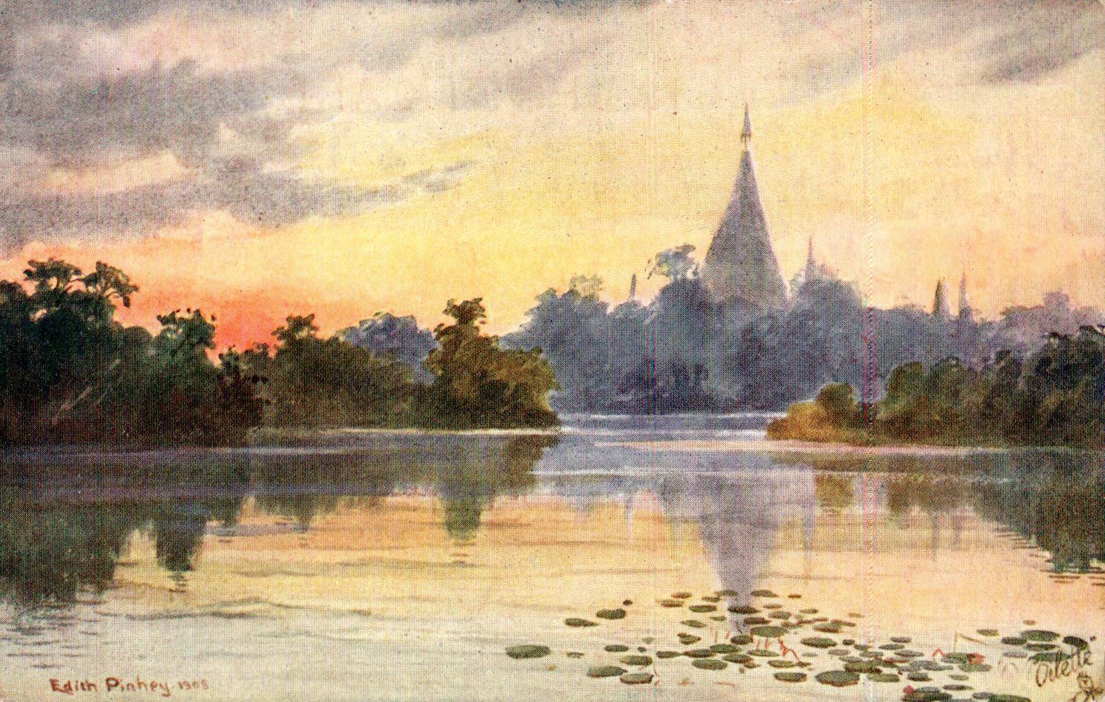 Ze schilderde veel Birmese uitzichten op pagodes in Mandalay, boeddhistische tempels, enz..