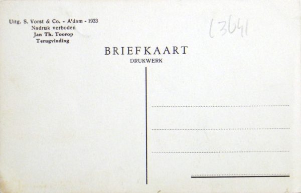 Van meerdere kunstenaars worden ook na hun dood nog kunstwerken verspreid via nadrukken of zoals in dit geval middels ansichtkaarten. En soms worden hun werken achteraf (zelfs seriematig) gedrukt en uitgegeven door meerdere uitgevers. Een terecht initiatief, want het werk van Toorop boeide en boeit nog steeds vele. En of het nu komt door zijn manier van tekenen, lithograferen of etsen dan wel de wijze waarop hij emoties weet toe te voegen aan schijnbaar minimale onderwerpen of personen, eenieder zal dat anders beleven.