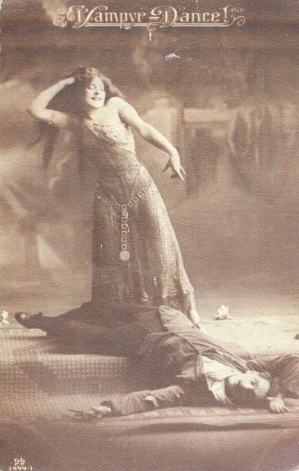 Over deze postkaart voorzien van een beeltenis (momentopname van een vroege musical / toneelvoorstelling / schilderij / pose met als onderwerp vanpiers en dansen; onduidelijk is het of er hier sprake is van een reproductie van een foto of van een schilderij) van een dansende vampier met haar slachtoffer konden we geen nadere informatie vinden.