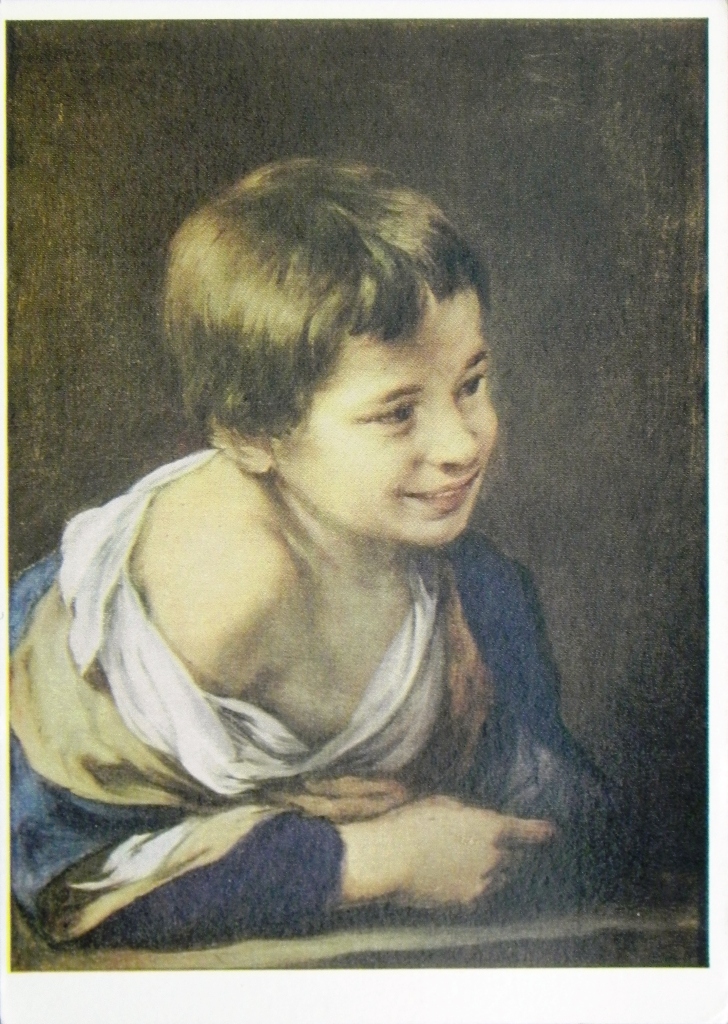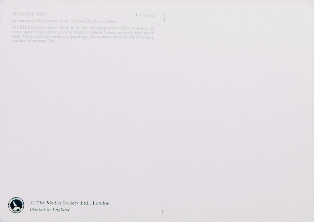 Van meerdere kunstenaars worden voortdurend – in dit geval van de hand van Bartolomé Esteban Murillo weliswaar lange tijd na zijn dood – kunstwerken verspreid via nadrukken of zoals in dit geval middels ansichtkaarten. Deze werd uitgegeven door The Medici Society, Londen (zie ook de tweede foto, nr. P.C. 1434). Een terecht initiatief, want dit fraaie schilderij van een lachend jongetje boeit de nieuwsgierige, hedendaagse mens nog steeds ongekend. Het origineel bevindt zich in de National Gallery, Londen.