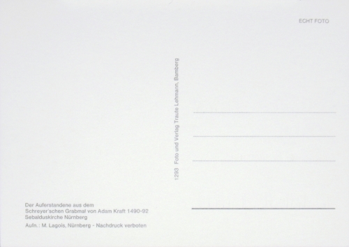 Van vele kunstenaars worden voortdurend – in dit geval van de beeldhouwer Adam Kraft – kunstwerken verspreid middels ansichtkaarten. De uitgever van deze ansichtkaart is Verlag Traute Lehmann, Bamberg (zie ook tweede foto, nr. 1293). Het origineel bevindt zich in de Sebalduskirche, Neurenberg.