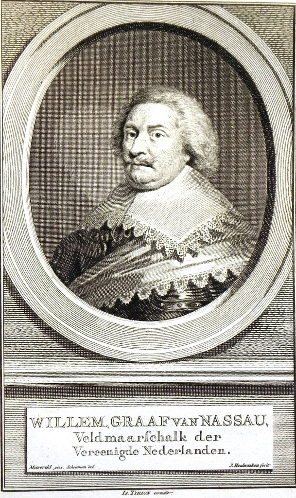 Deze staalgravure van Jacob Houbraken naar het portret door Aert Schouman / Leopold Miereveld van Willem, Graaf van Nassau werd uitgegeven door Isaak Tirion, Amsterdam.