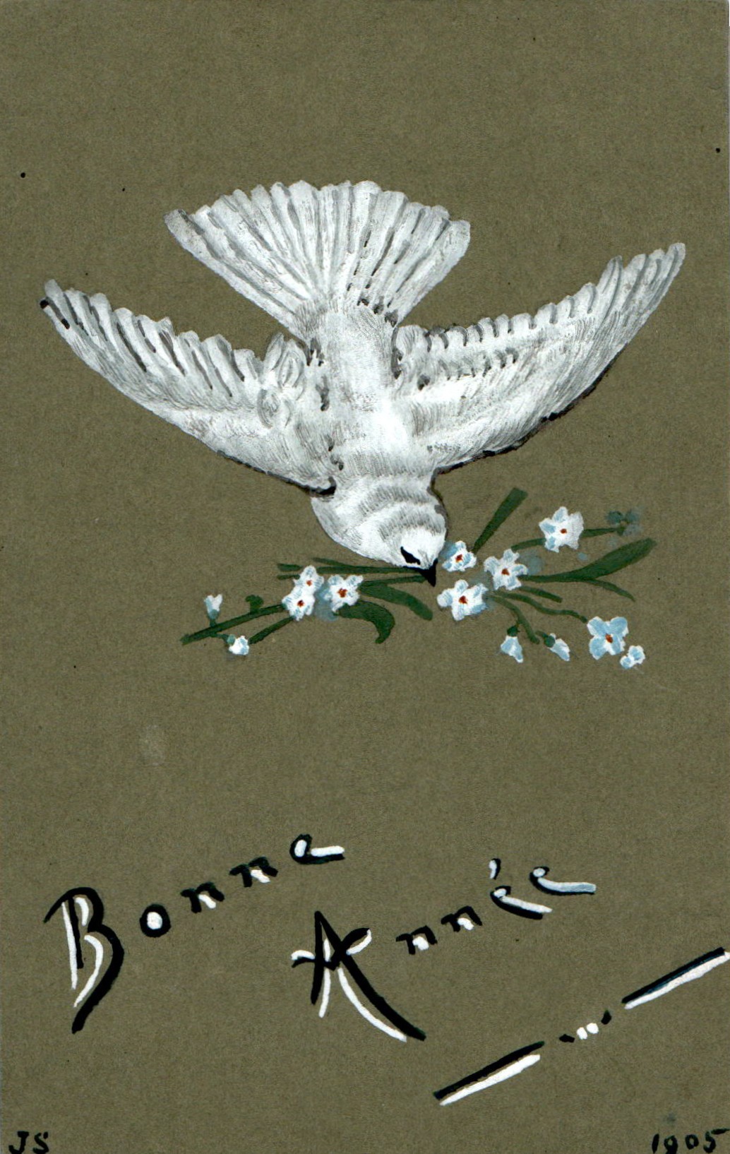 De afbeelding toont een vintage Franse nieuwjaarskaart uit 1905 waarop een duif te zien is. De duif houdt een takje met vergeet-mij-nietjes vast.