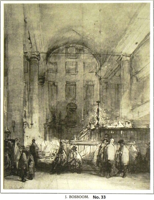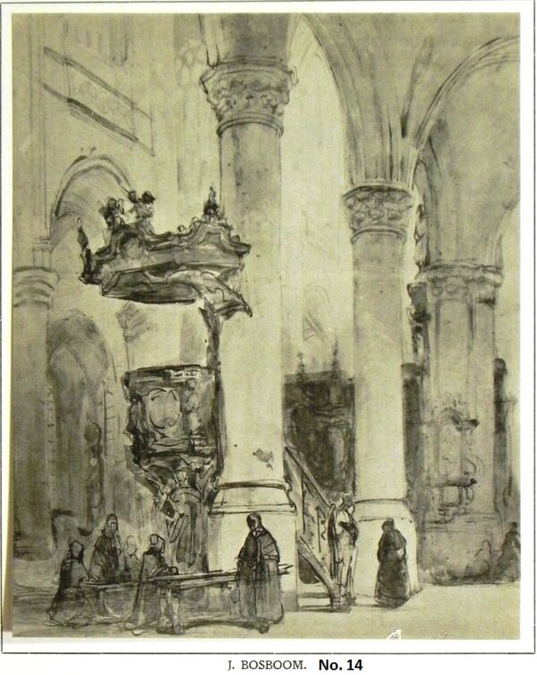 - Om de preekstoel. Aquarel 41-30. Geteekend onder rechts: J. BOSBOOM, ’s Bosch 1839.