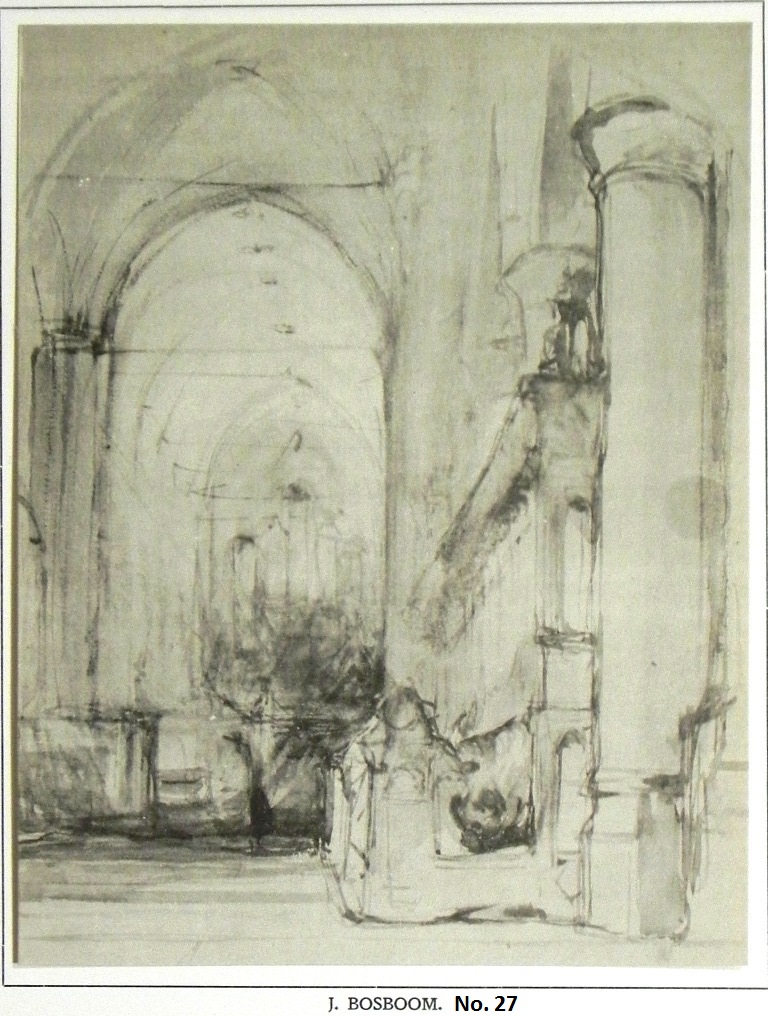 kleuren in het vergrijzende wit der muren, schaduwen die met alle kracht een fijnheid houden vooral in de zijmuren van het wijkende langschip. Maar ook de wijze waarop BOSBOOM hier voor een rustiger afsluiting van den voorgrond gezorgd heeft, wijst er op hoe hij hier meer dan een schets op het oog had; als geheel geeft deze teekening dan ook reeds een bevredigenden indruk, er zit een samenhang in, die geen onderdeel te veel afzonderlijk doet voelen, en zelfs de stoffage der vier figuurtjes geheel ongemerkt in zich opneemt. Toen BOSBOOM dit maakte moet hij reeds een vrij zeker gevoel gehad hebben van wat hij in zijn leven tot stand wenschte te brengen.