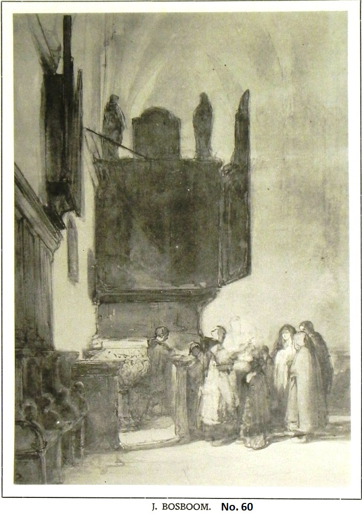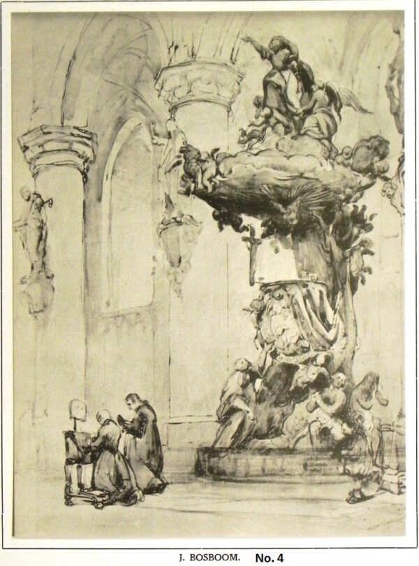 - Preekstoel in de kerk te Mechelen. Sepiateekening, 43-32. Geteekend onder rechts: J. BOSBOOM. 1842, onder links: Gen. 3-15 Malines. 1842.