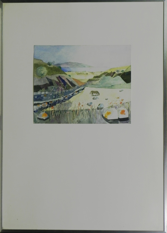 Een sterk geschematiseerd Grieks landschap van Bitter. Toch weet Theo op spannende manier ‘heel’ Griekenland op deze aquarel te verenigen. Van vakantieland (tenten op de voorgrond), verspreid de Griekse land- en tuinbouw activiteiten, het Griekse berglandschap tot de zee met het eilandenrijk in de verte.